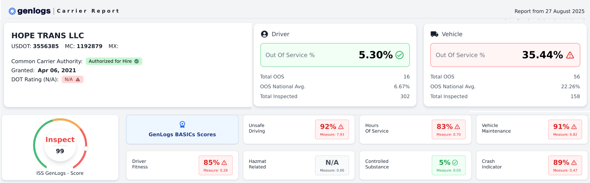 This is where GenLogs comes in. By reverse-engineering FMCSA’s non-public BASIC percentages and ISS scores, GenLogs gives brokers access to a level of insight that has traditionally been limited to carriers and regulators.