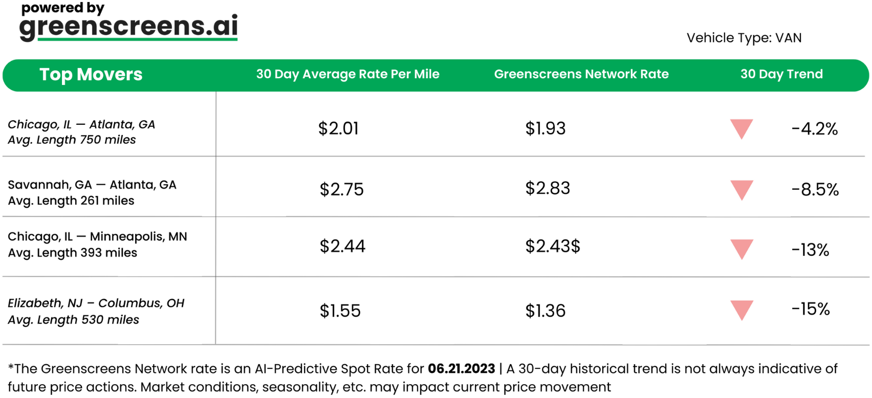 *Greenscreens.ai, forecasts real-time truckload buy prices that are suited to each freight brokerage's purchasing power using AI and machine learning. Its engine takes into account over 130 attributes and data points in each rate forecast.