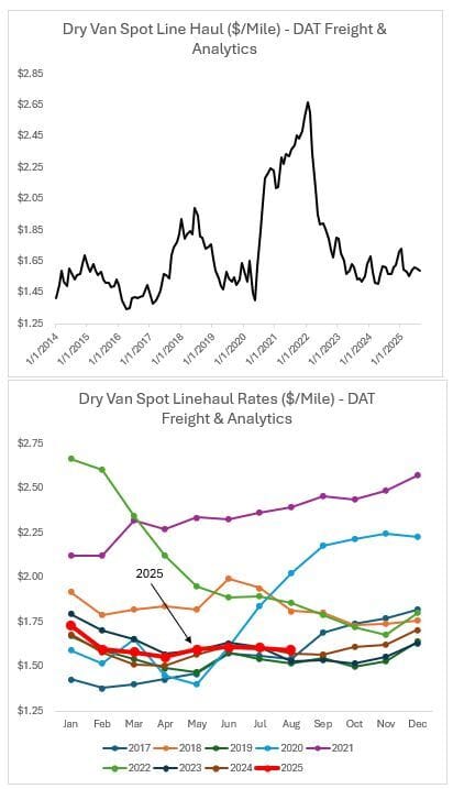 Miller pointed to DAT’s dry van spot linehaul rates, which have remained flat through August, showing no signs of a capacity squeeze. "2025 looks like 2024," he noted, reinforcing his long-held view that bull markets are driven by demand, not minor supply-side shocks.