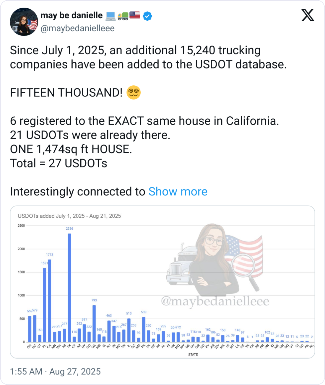 Danielle Chaffin’s latest discovery points to a troubling pattern hidden in plain sight: since July 1, more than 15,000 new trucking companies have been added to the USDOT registry—including dozens linked to the same residential address. The clustering of 27 USDOT numbers at a single 1,474 sq. ft. house in California raises serious questions about ongoing fraud, identity misuse,