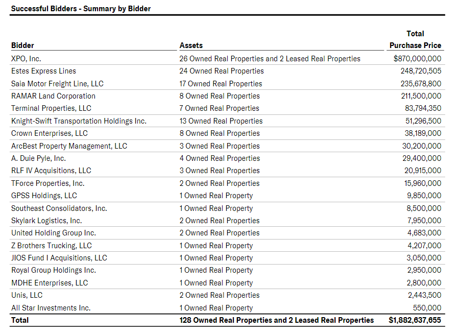The auction involved large less-than-truckload carriers and also attracted real estate investors. With 130 of Yellow’s properties sold, the process is still underway for the remaining 46 owned and some leased properties.