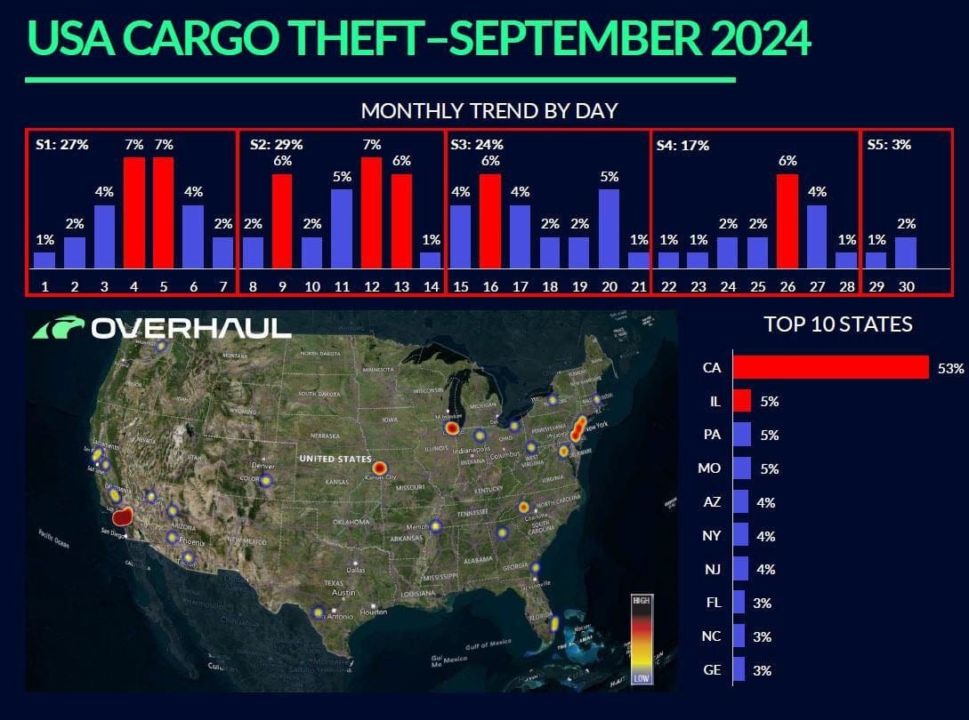 š September 2024 Cargo Theft Highlights. Overhaulās September data shows California as the top hotspot for cargo theft, with 53% of incidents. Electronics were the most targeted product, and thefts were highest from Tuesday to Thursday, primarily involving full truckloads (30%) and last-mile couriers (28%). Key hotspots included Southern California, Chicago, Philadelphia, and Kansas City. Many incidents occurred at unattended warehouses, distribution centers, or delivery points. Violent thefts involving armed criminals against truck drivers were notably high in North Carolina and Maryland. With the holiday season approaching, these trends may continue.