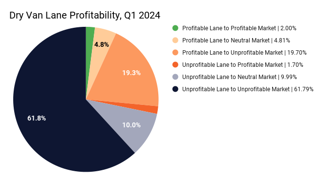 SmartHop data shows that in Q1 2024, nearly 62% of dry van loads were hauled on an unprofitable lane into an unprofitable market.