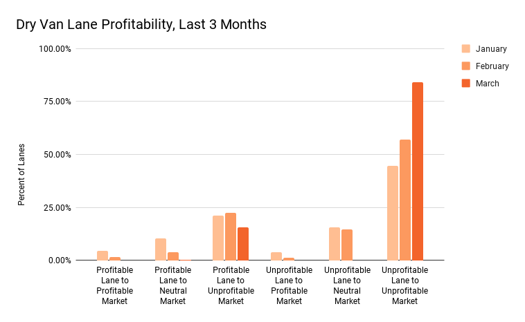 From the data in the above chart showing Dry Van Lane Profitability over the last three months, there's a distinct pattern in March that's hard to miss. In March, the percentage of unprofitable lanes to unprofitable markets shot up to over 75%.
