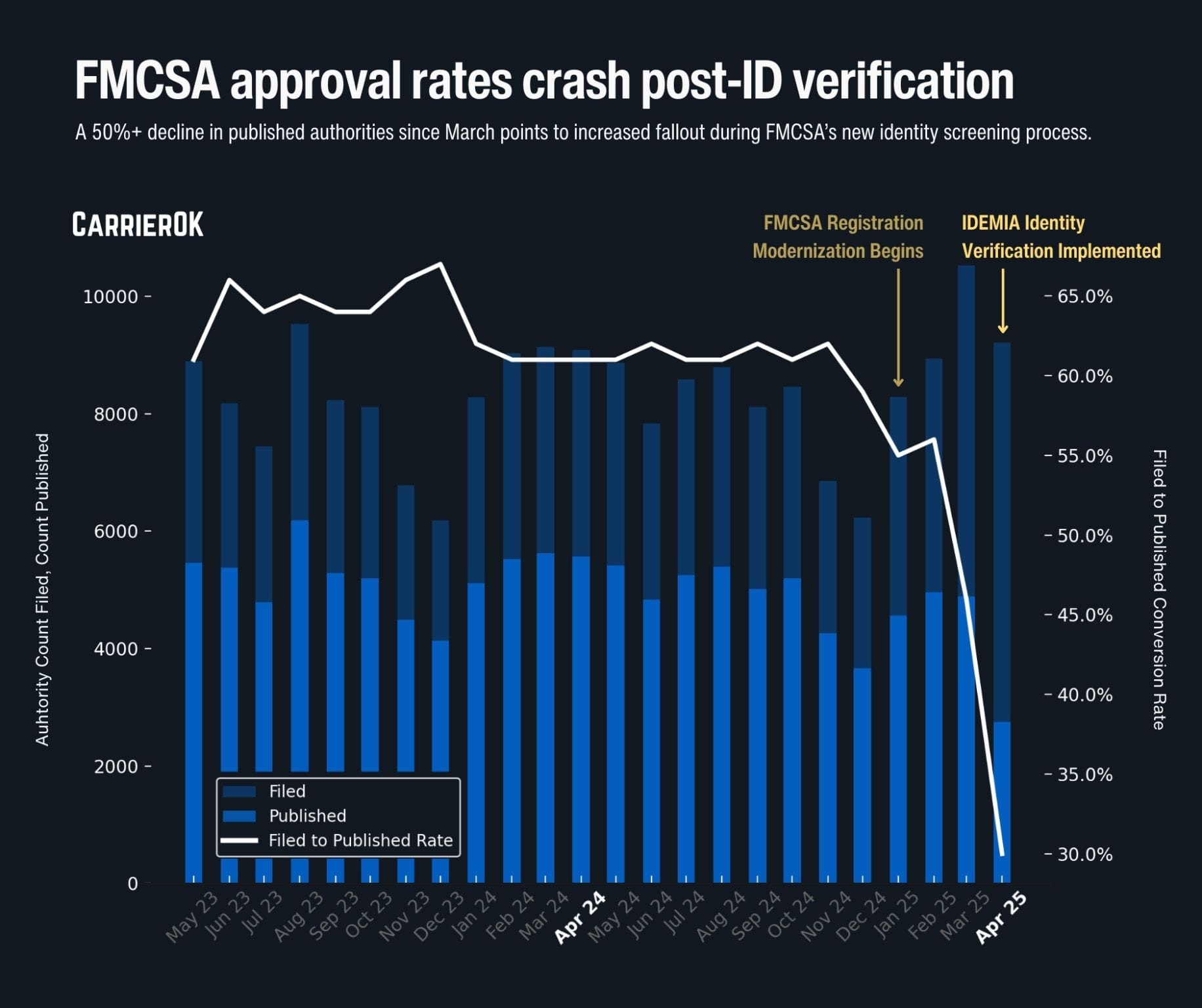 "A 50%+ decline in published authorities in the month after implementing facial ID verification is a dramatic signal that the agency has tightened the funnel." –CarrierOK