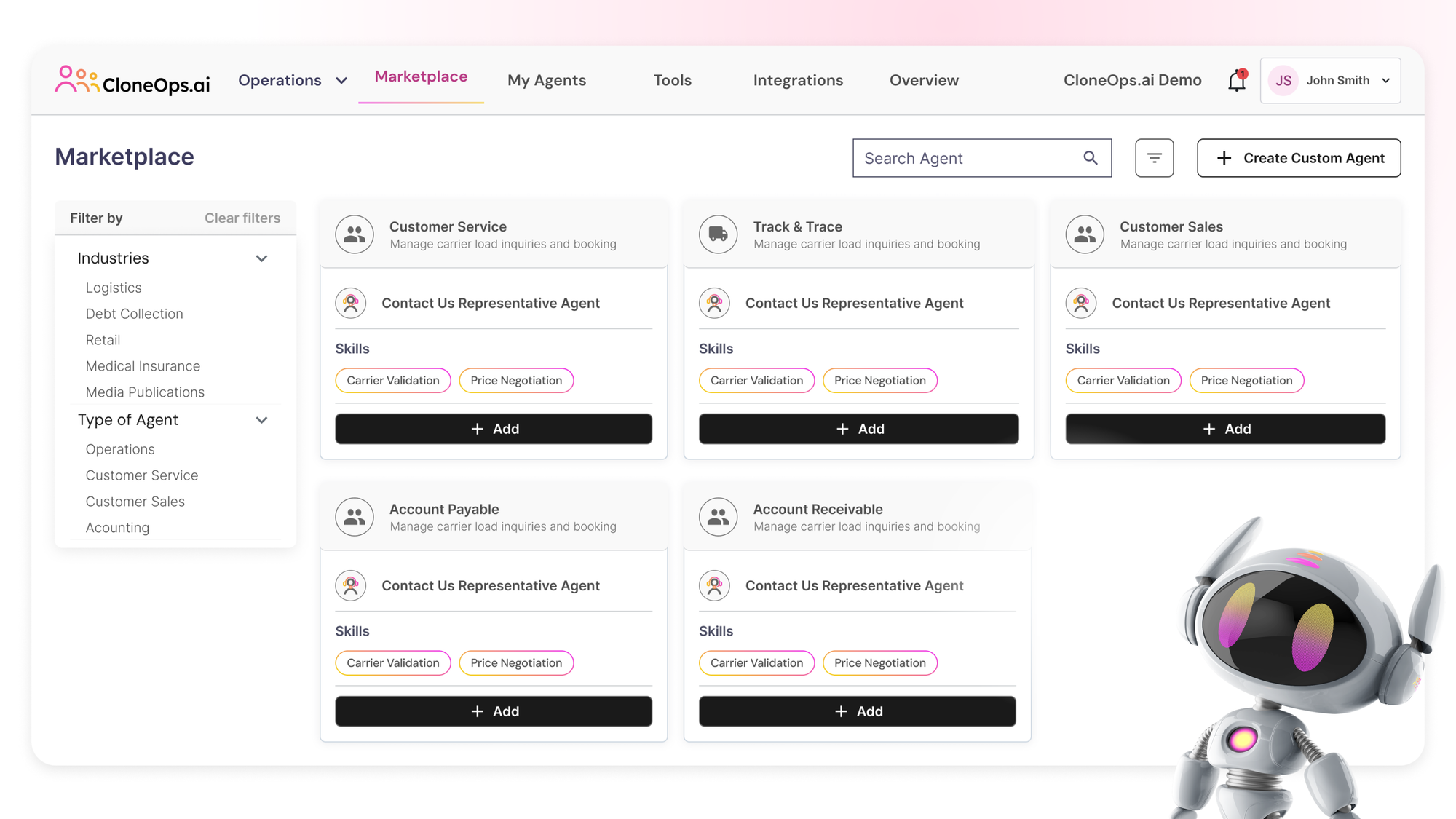 With CloneOps.ai, logistics teams get a partner who works with you to deploy agents where they’ll deliver the most impact, without upending your operations. Start with one task, prove the value, and grow from there with CloneOps.ai supporting every step.