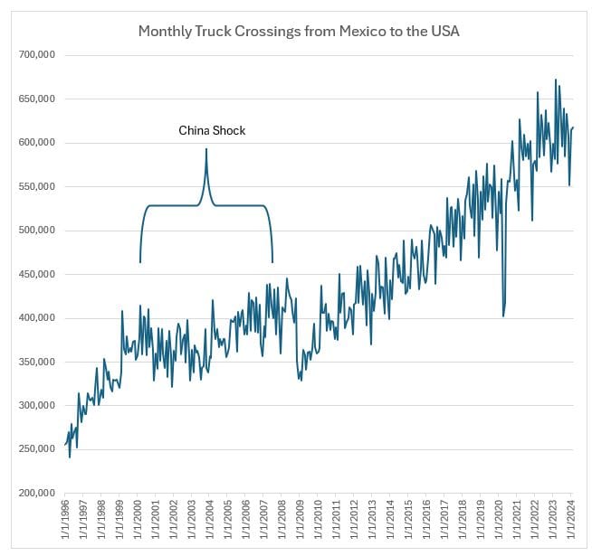 Supply chain expert Jason Miller points to a significant uptick in northbound truck crossings from Mexico—up 4.3% from last year and 16.5% above 2019 levels.