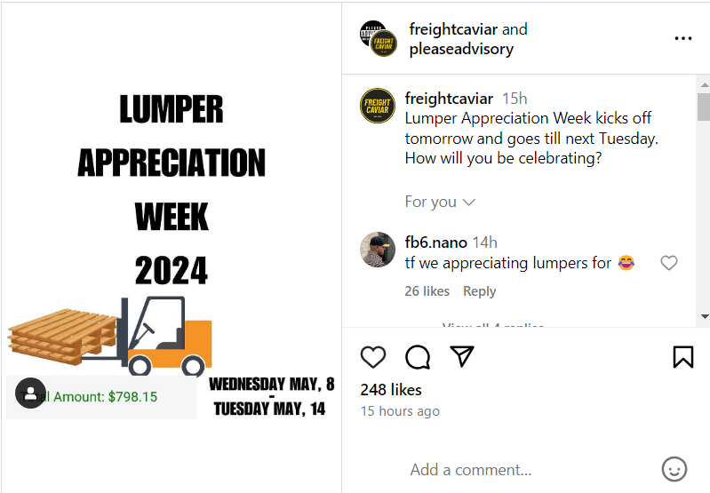 💳 It's Lumper Appreciation Week. Ever heard of Lumper Appreciation Week? Yup, it's a thing—kind of. Sparked by Reed Loustalot as a bit of a gag, this celebration spotlights those contracted workers who unload trucks for a fee. While places like Walmart have recently done away with lumpers, many continue to hold on to this frustrating tradition. It's mandatory and often a headache for carriers and brokers. Still, raise your comchecks in dubious honor—Lumper Appreciation Week is from May 8 until May 14. Be sure to share how you feel about it!