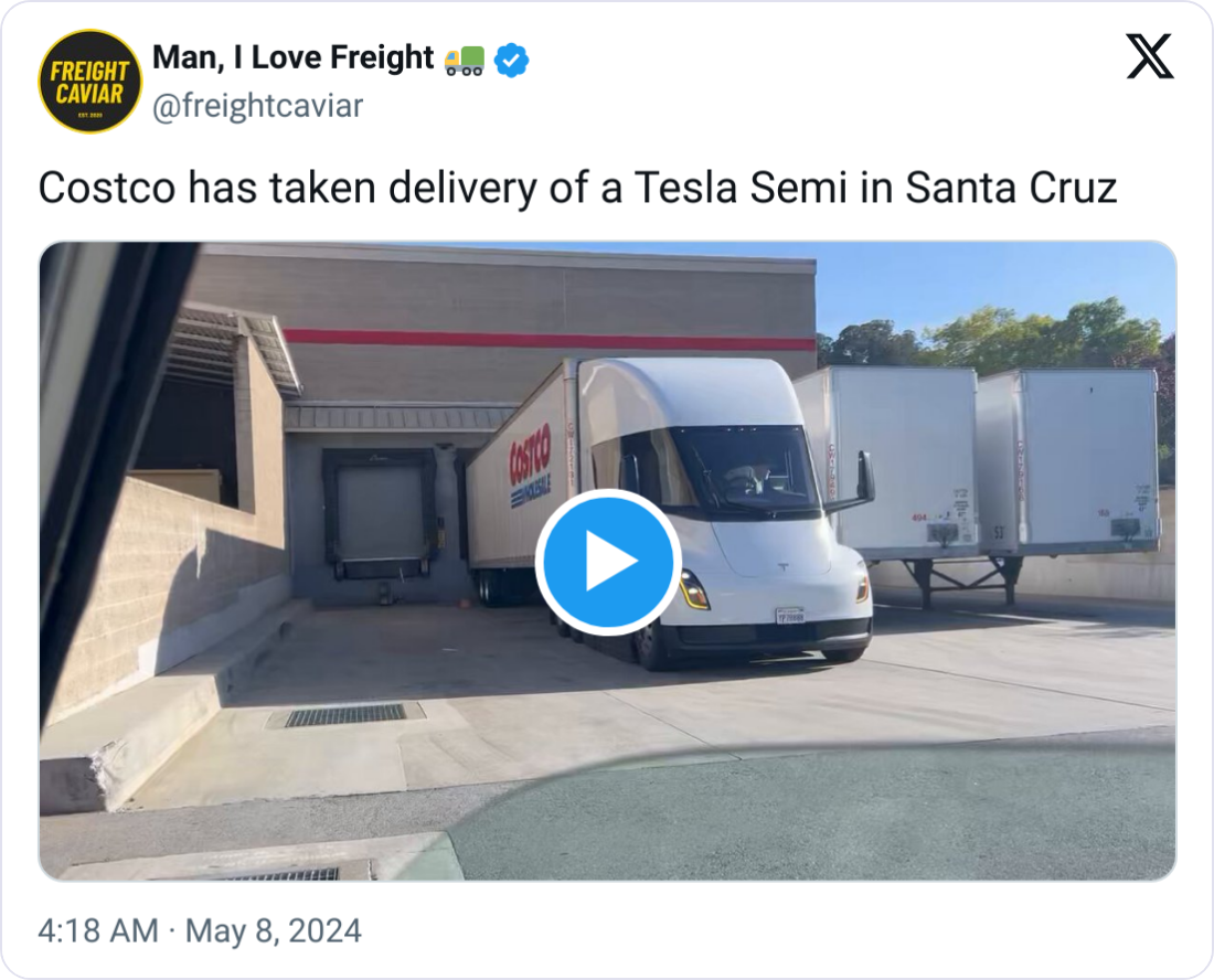 🚚 Tesla Semi Expansion. Costco is the latest to receive a Tesla Semi, joining Walmart and others as Tesla ramps up deliveries despite previous delays.