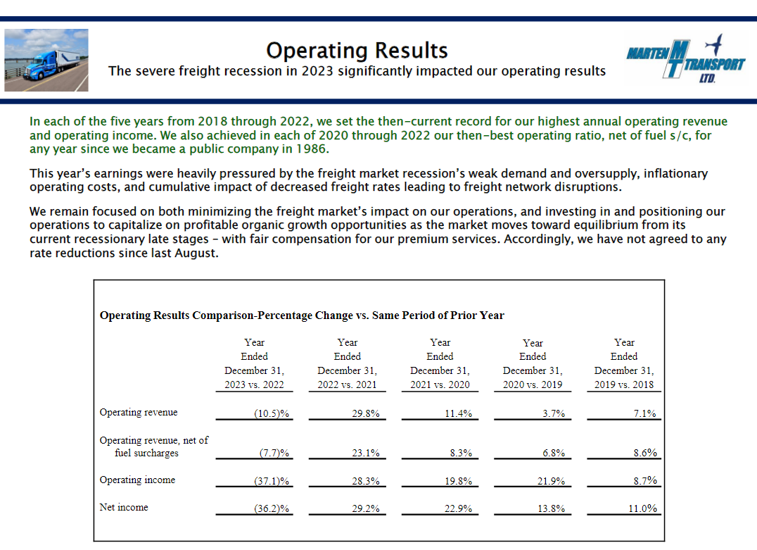 Marten Transport's Q4 2023 net income fell sharply despite efforts to maintain service rates and manage increased insurance costs.