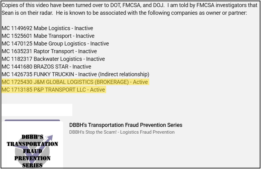 A new wave of online investigations has put Sean Mabe, owner of P & P Transport LLC (MC1713185) and J&M Global Logistics (MC1725430), at the center of intense scrutiny from independent freight watchdogs.