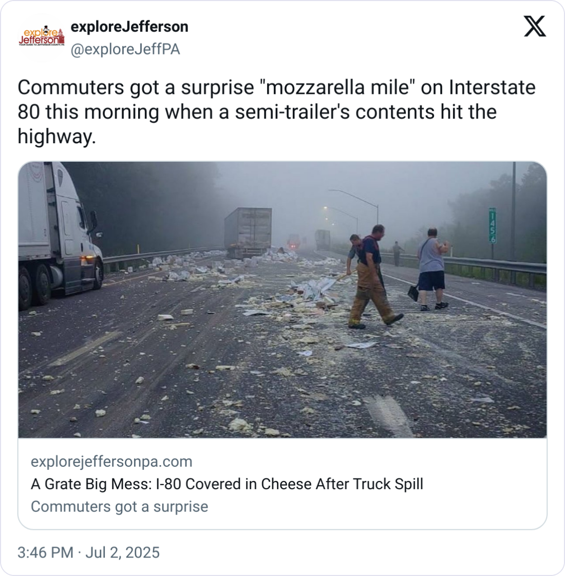 đź§€ Cheezy Mess. A truck carrying mozzarella cheese overturned in Pennsylvania on July 2, spilling product 200 yards across the roadway and disrupting traffic. Cleanup crews responded quickly; no injuries were reported.