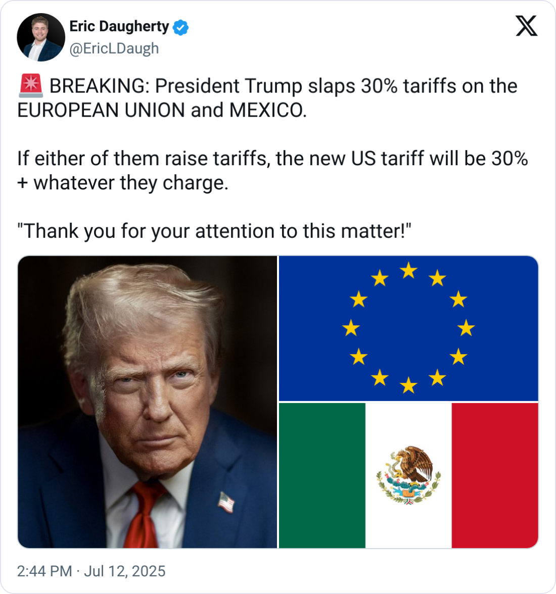 🇲🇽 Mexico Remains Top U.S. Trade Partner, but Faces New 30% Tariff Threat from Trump. Mexico led all U.S. trade partners in May with $74.5 billion in total trade, driven by strong computer and auto exports. But a new 30% tariff announced by President Trump, set to potentially take effect August 1, threatens to disrupt cross-border supply chains. Citing national security and fentanyl concerns, the proposed duties on Mexican and EU imports have sparked backlash from international leaders and cast uncertainty over USMCA protections. “Mexico has been helping me secure the border, BUT, what Mexico has done is not enough,” Trump stated. Freight professionals now face mounting costs and compliance risks as frontloading and routing adjustments accelerate ahead of the deadline.