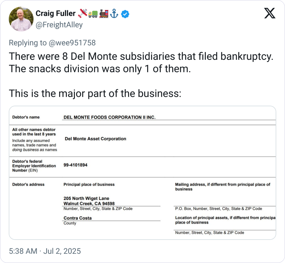 💥 Del Monte’s $1B Bankruptcy; Uber Freight Owed $9M. Del Monte Foods has filed for Chapter 11 bankruptcy with over $1 billion in liabilities and more than 10,000 creditors. Uber Freight (via Transplace) is listed as the second-largest unsecured creditor, owed $9 million. Other logistics firms impacted include Saddle Creek Logistics ($1.3 million) and CHEP USA ($470K). Del Monte, which posted $1.7B in 2024 revenue, secured $912.5 million in DIP financing to maintain operations while pursuing asset sales. Freight providers may continue services, but unpaid pre-petition balances are at risk.