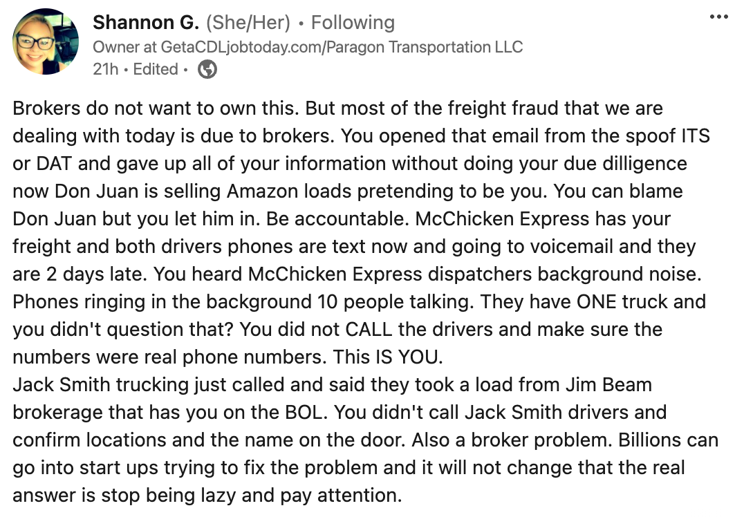 👮♀️ Broker Accountability for Freight Fraud. Owner of Paragon Logistics says brokers shoulder blame for freight fraud by failing due diligence, enabling bad actors to impersonate carriers and steal loads.