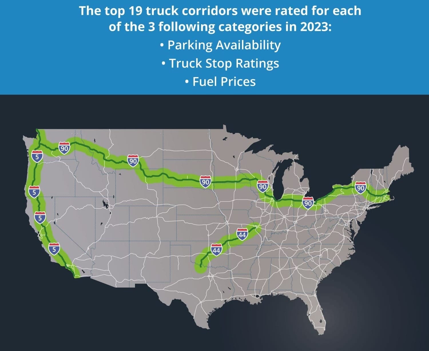 🚚 Top Trucker Corridors. Trucker Path released the most driver-friendly freight corridors: I-90 (Seattle-Boston), I-5 (West Coast), and I-44 (Texas-St. Louis) - scoring in the 90s for parking, amenities, and fuel prices. These overlap major DOT-mapped truck/rail arteries like I-5 and I-90, making sense as busier routes cater better to driver needs. While challenges remain industry-wide, these highways stand out.