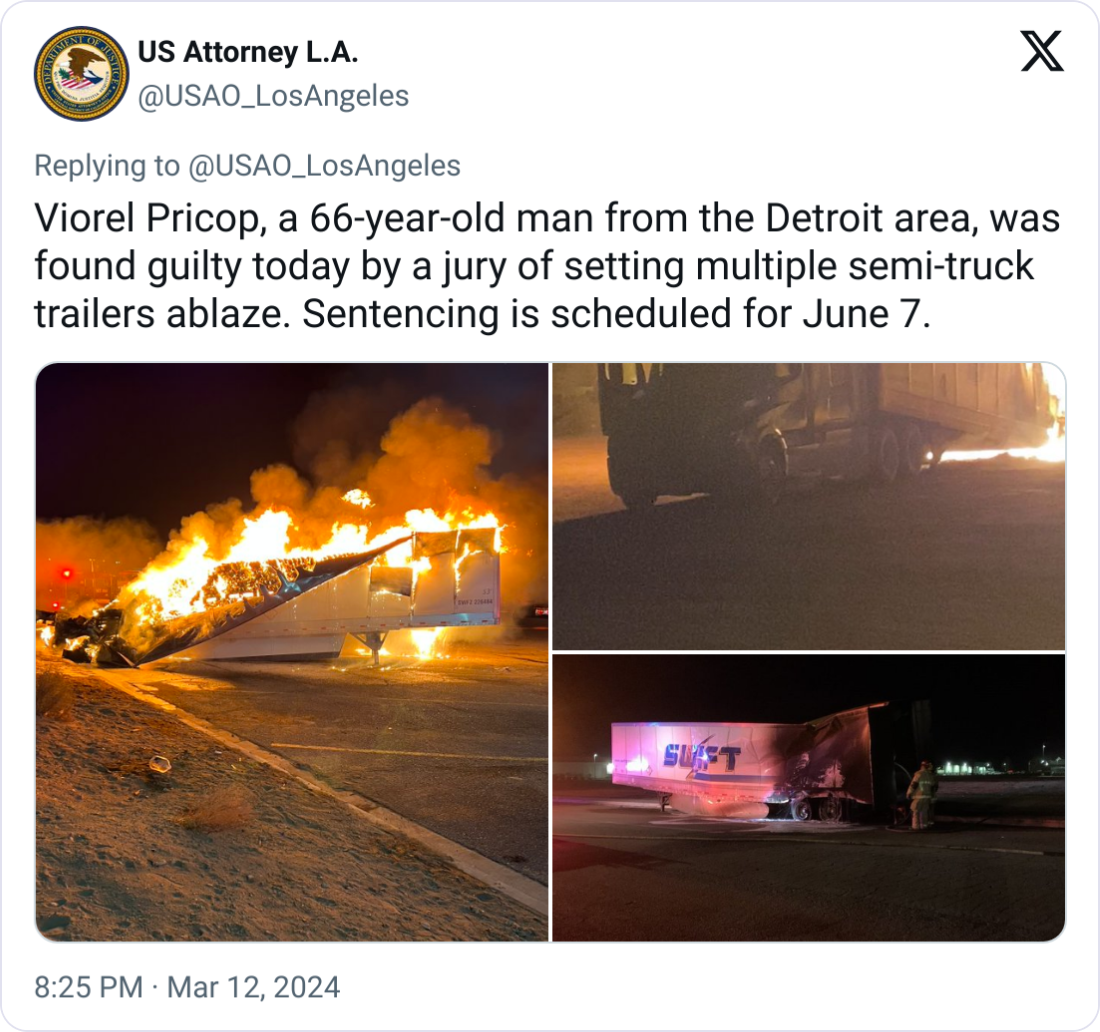 Authorities linked Pricop to the fires using cell tower data and search warrants. He faces additional charges in New Mexico and Arizona.