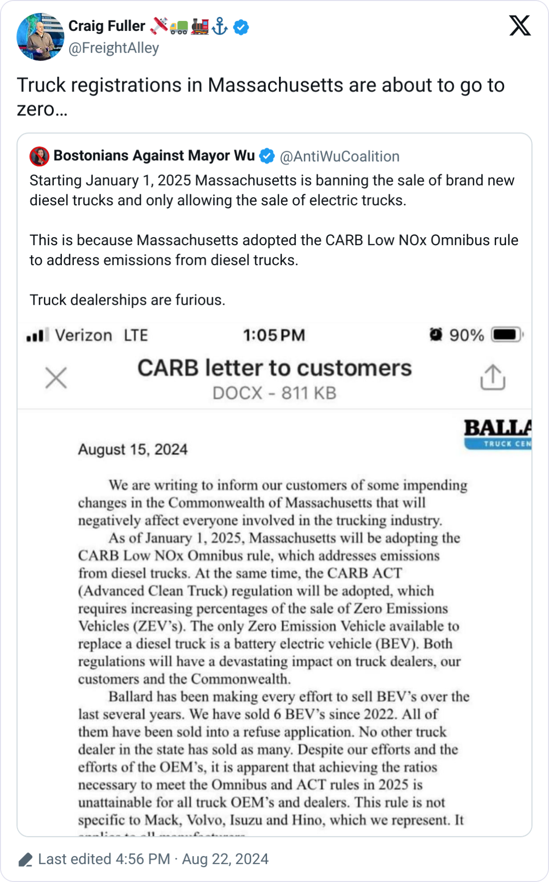 ⛽ No More Diesel Trucks in MA. Starting January 1, 2025 Massachusetts is banning the sale of new diesel trucks. Only electric truck are allowed to be sold in the state afterward.