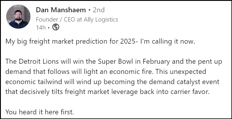 Dan Manshaem, CEO of Ally Logistics, shared his humorous prediction on LinkedIn: