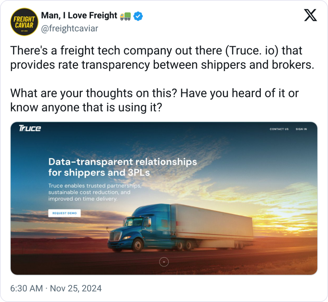 💸 Rate Transparency Tech. A freight tech company is bringing rate transparency between shippers and brokers. What are your thoughts on this? Share on Instagram, LinkedIn, or X.