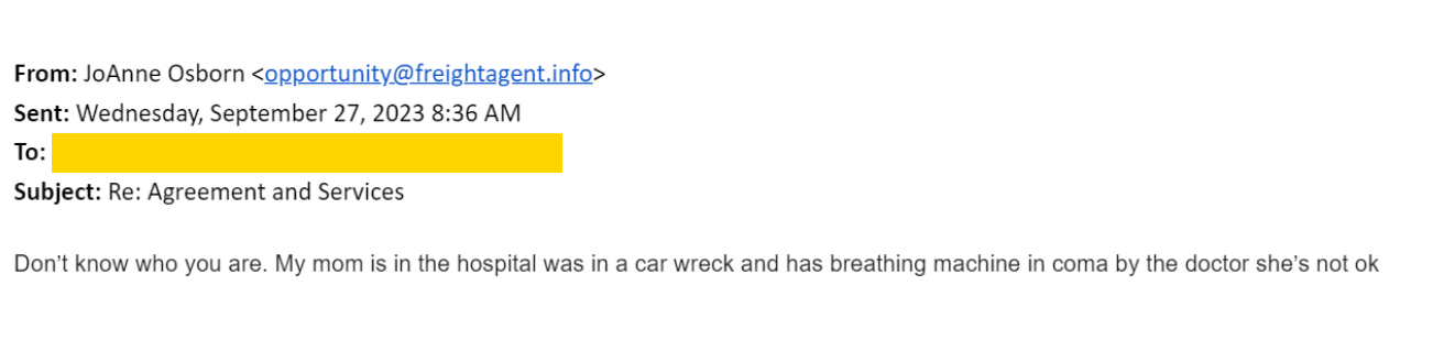 After the freight brokerage sent a threat of legal action to JoAnne, they finally received a reply: Don't know who you are. My mom is in the hospital was in a car wreck and has breathing machine in coma by the doctor she's not ok.