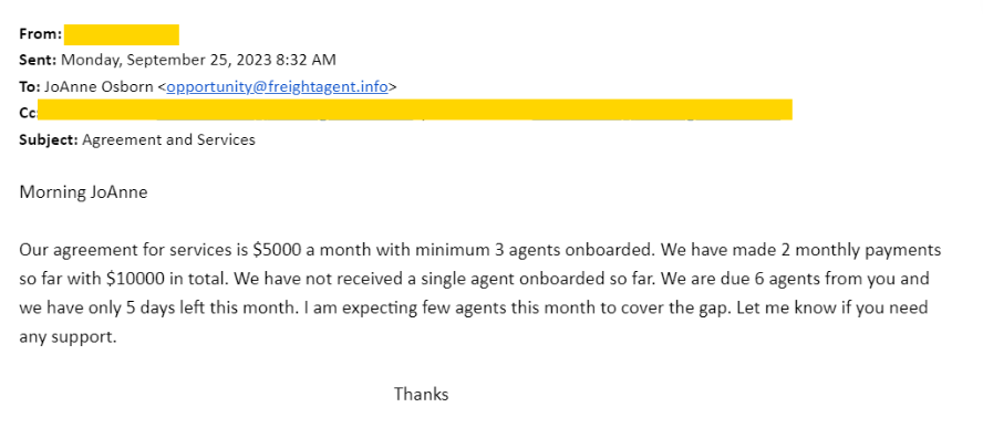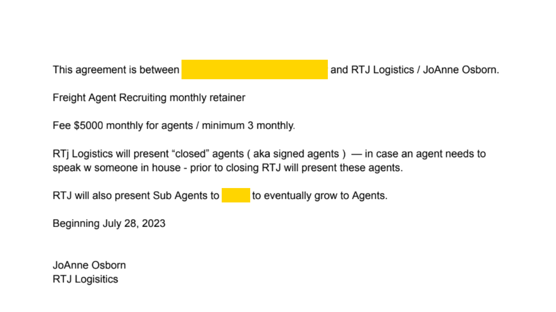 Enter "RTJ Logistics" and their recruiter, JoAnne Osborn, promising the moon–three new agents a month for a sum of $5,000 monthly.