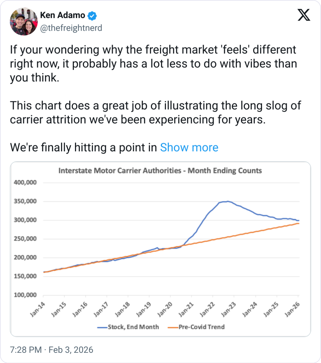 According to Ken Adamo, Chief of Analytics at DAT, the total pool of interstate motor carriers has now fallen back to a pre-COVID growth trend.