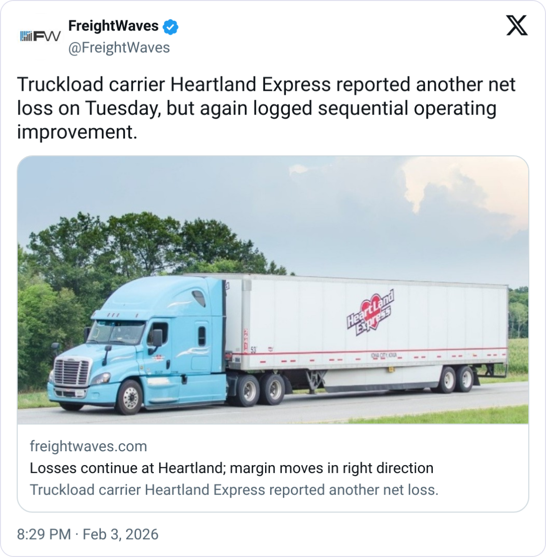 📉 Heartland Still Losing Money. Heartland Express reported another quarterly loss, but posted its third straight period of sequential margin improvement as it cuts unprofitable freight, consolidates fleets, and positions for a potential market recovery later in 2026.