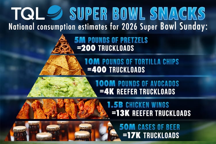 With Super Bowl LX this Sunday, TQL broke down how much game-day food is estimated to be consumed, and how that translate to the amount of truckloads.