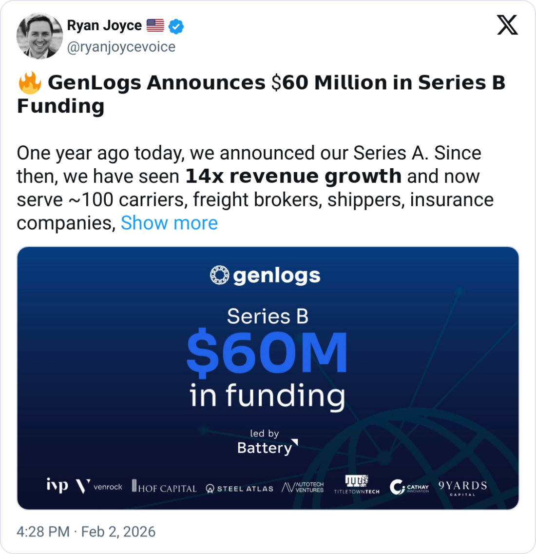 GenLogs raised $60 million in Series B funding on Feb. 2, 2026, bringing total funding to $81 million, as it looks to expand its truck-tracking and supply chain intelligence platform.