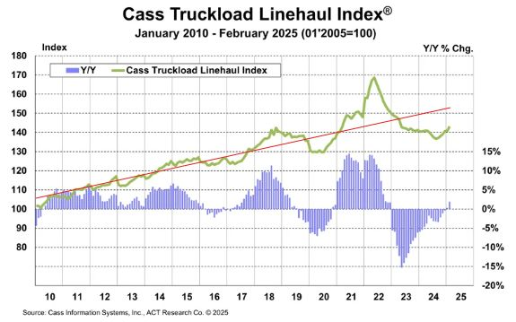 📊 Cass Linehaul Index Dips. The Cass Truckload Linehaul Index shows a recent dip in freight rates, but Dan Manshaem from Ally Logistics added a red trend line to roughly estimate long-term rate inflation, suggesting a potential recovery despite current challenges.
