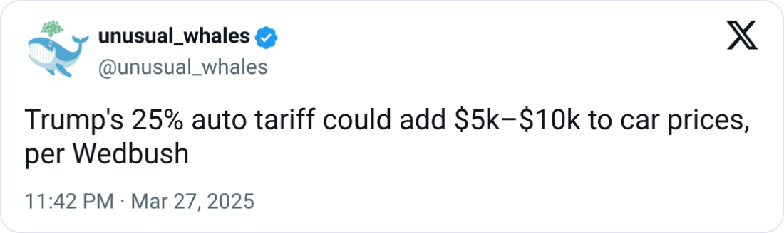 🚘 Trump’s 25% Auto Tariff. President Trump announced a 25% tariff on imported cars and auto parts, effective April 3rd, aiming to boost U.S. manufacturing and jobs. The tariff replaces the current 2.5% rate and applies to vehicles made outside the U.S., including American brands with foreign assembly. “If you build your car in the U.S., there is no tariff. That means a lot of companies will be in great shape because they’ve already built their plants,” Trump said. “I think our automobile businesses will flourish like they’ve never flourished.” Critics warn that car prices may rise by up to $12,500, impacting consumers and supply chains. While some USMCA-compliant parts may be exempt, details remain unclear. Trump also hinted at tax breaks for buyers of U.S.-made cars. The move has sparked international backlash, with Canada and Europe considering retaliation.