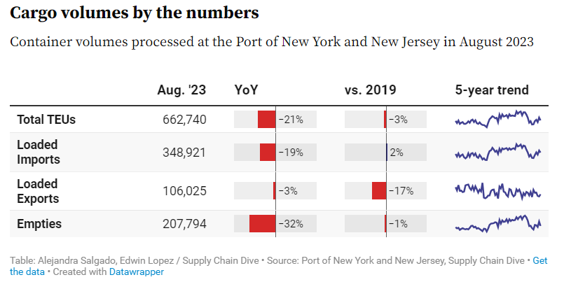 Cargo volumes at the Port of New York and New Jersey fell 21% YoY to 662,740 TEUs in August as the seaport adjusts to lower retail volumes.