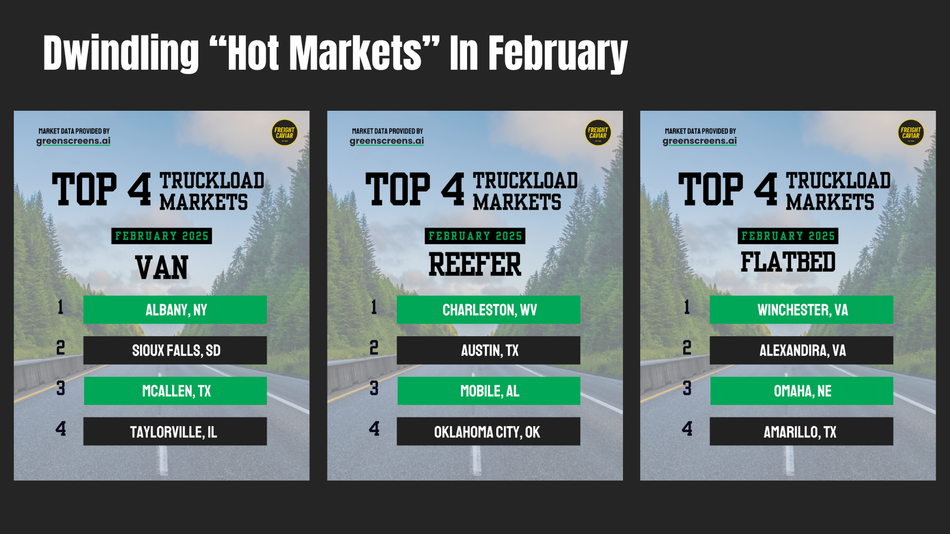 No āHotā Markets in February:Greenscreens.ai data reveals that no truckload markets were hot enough to make their usual āhigh-demandā list last month, signaling an industry still waiting for its next big push.