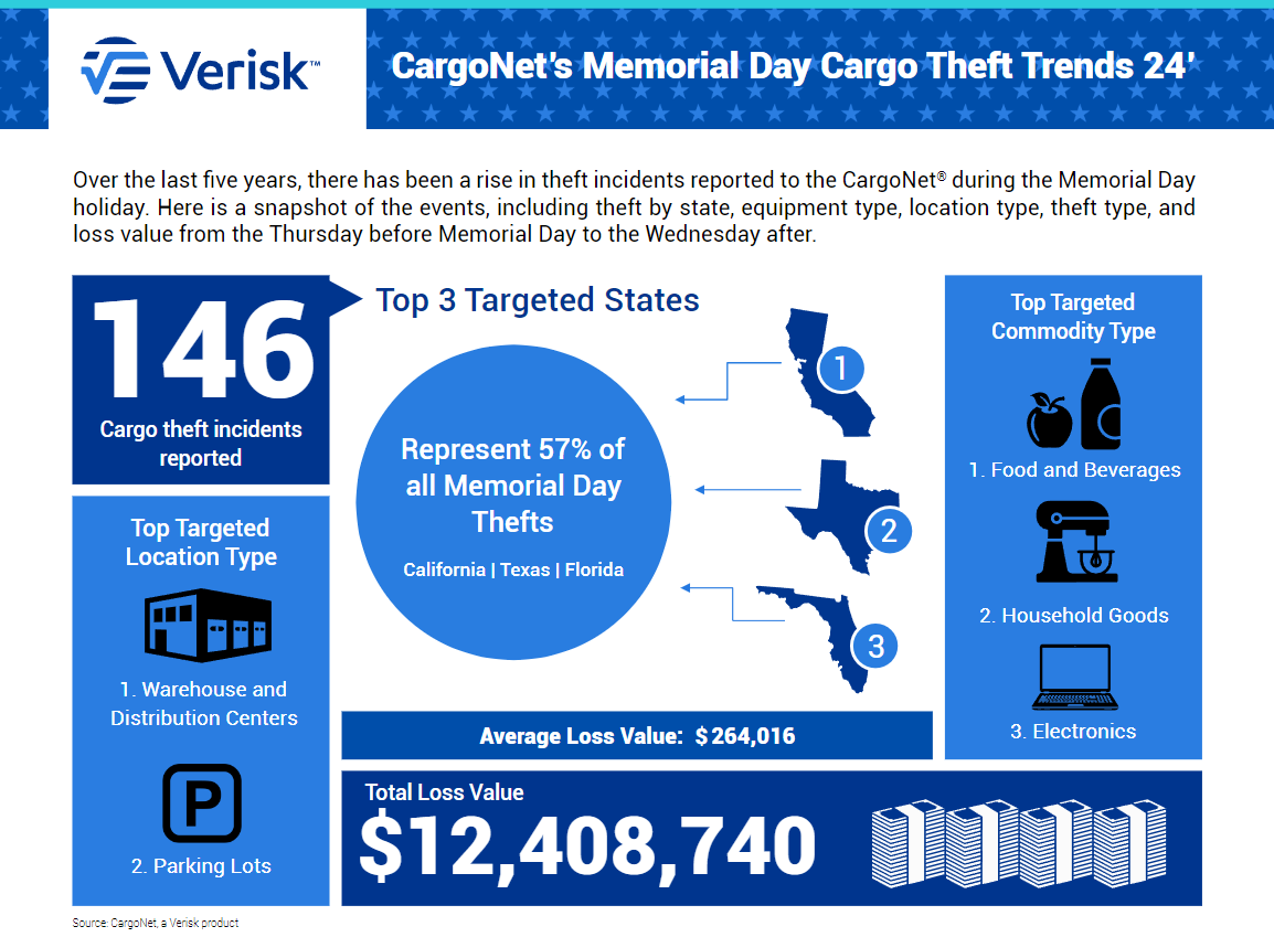 🕵️ Memorial Day Cargo Theft Alert. CargoNet warns of increased cargo theft during Memorial Day weekend, noting a significant trend in theft events from previous years. Supply chain professionals should enhance security, especially in high-risk states like California, and for targeted commodities like food and electronics.