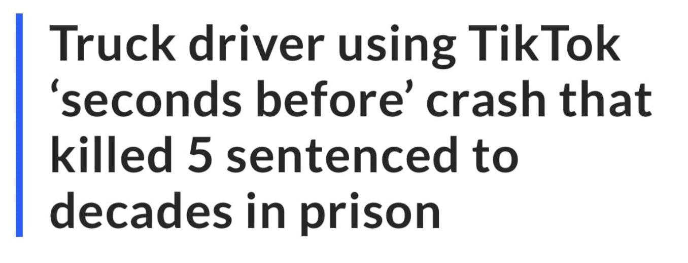 📱 Truck Driver Sentenced in Deadly Crash. Danny Glen Tiner has been sentenced to over 22 years in prison for the fatal crash that killed five people in Arizona after digital evidence showed he was using TikTok seconds before the collision. He was also going 68 mph in a 55 mph construction zone. MCAO Attorney Rachel Mitchell stated Tiner had accessed four separate TikTok videos before the accident, “As a driver, you have an obligation to pay attention to the road. To choose to access social media while driving, placing the lives of others on the line, is reckless.”