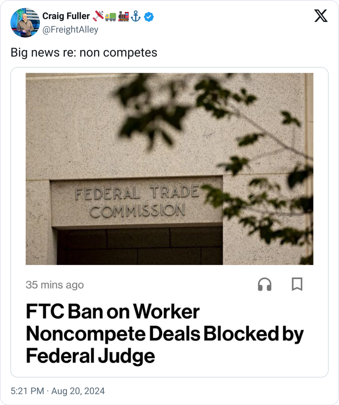 🚚 The Noncompete Ban. The FTC ban on worker noncompete deals was blocked by a federal judge. Matthew Leffler tweeted his prediction about a lengthy appeal process is upcoming.