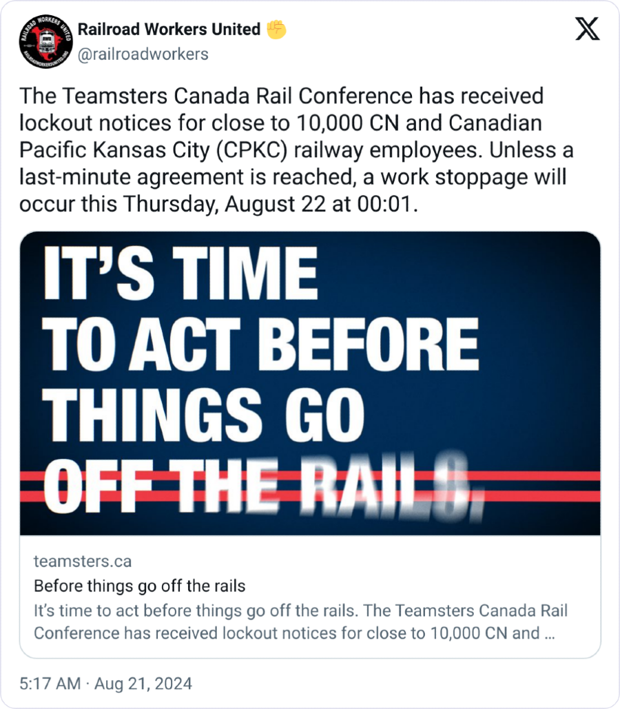 A major rail workers' strike in Canada might start Thursday, August 22. This would be the first time both Canadian National Railway (CN) and Canadian Pacific Kansas City (CPKC) face a strike at the same time.
