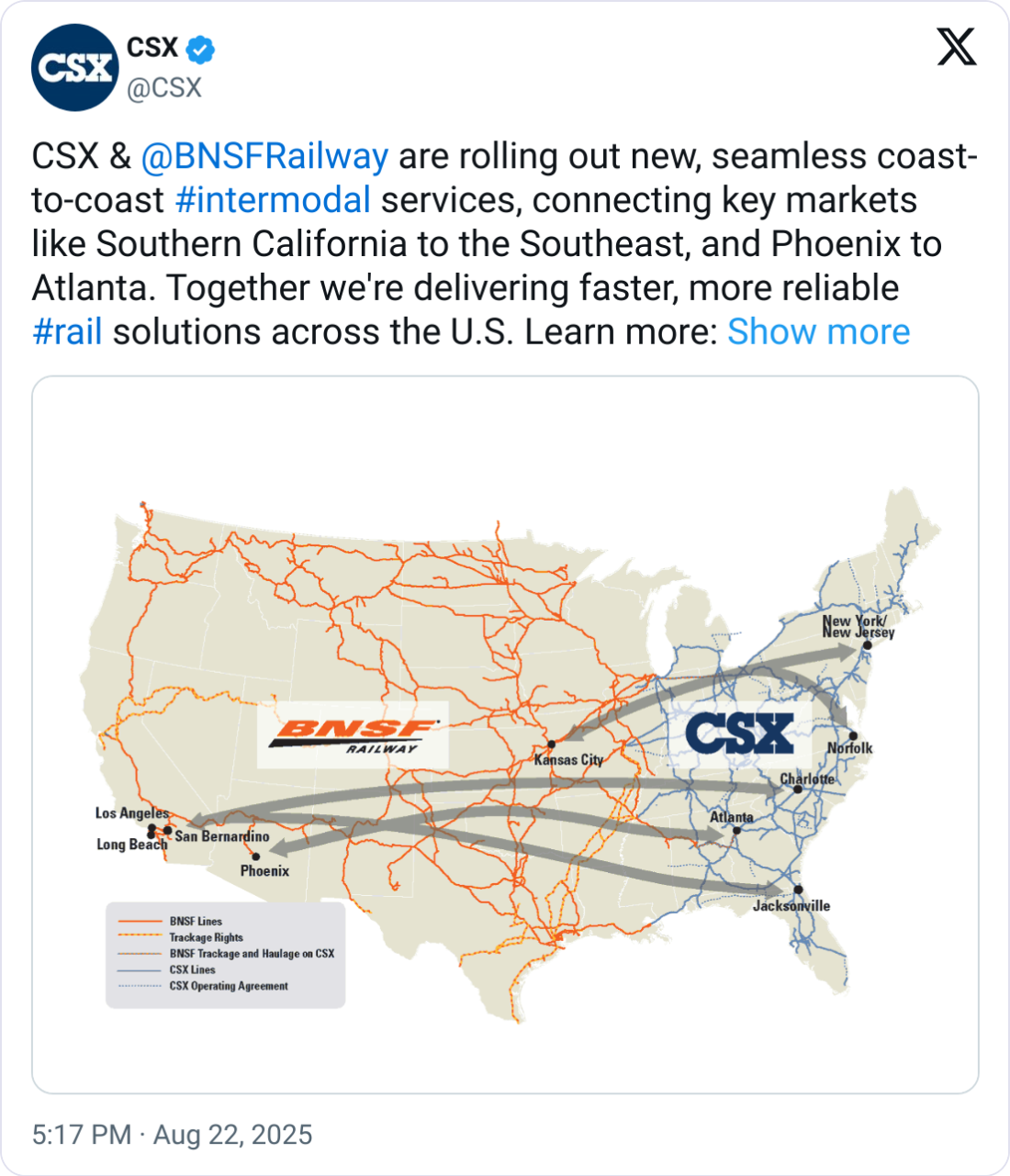 🚂 Another Rail Merger In The Works? CSX is under pressure from activist investors Toms Capital and Ancora Holdings to pursue consolidation after Union Pacific’s $71.5 billion Norfolk Southern acquisition. Ancora blasted CEO Joe Hinrichs for “anemic shareholder returns” and warned of a proxy fight. Speculation is mounting over a possible BNSF–CSX merger that could create a $200 billion coast-to-coast network. At the same time, CSX and BNSF announced new intermodal services linking Southern California with Charlotte and Jacksonville, Phoenix with Atlanta, and the Port of NY/NJ with Kansas City. With regulators signaling openness to mergers, CSX’s role in the next phase of rail consolidation is pivotal.