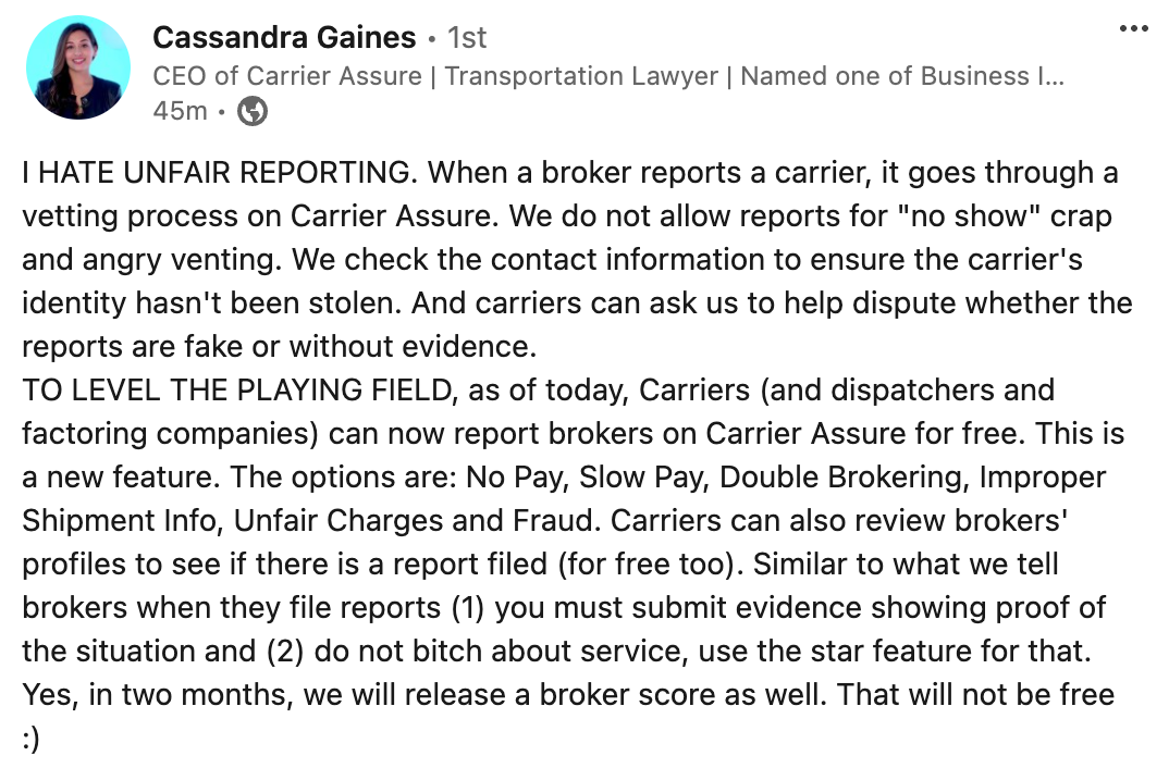 ๐ป Two Freight Tech Updates. After years of complaints from the trucking community about unfair carrier reporting sites, carriers can now report brokers for issues like no pay, slow pay, fraud, and more on Carrier Assure. In a more controversial change, DAT has informed customers via email that they will be discontinuing DAT Power over the next month, requiring all customers to switch to DAT One. However, DAT One has faced significant criticism, with 55% of our audience polled in March stating they hated it and another 26% stating it's okay.