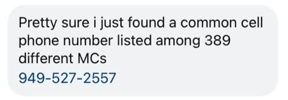 ๐ Suspicious Number Alert. An Instagram follower informed us that the phone number 949-527-2557 is associated with 389 different MCs. Given that the 949 area code is from Orange County, California, this isn't surprising.