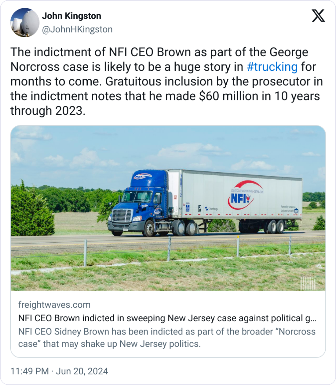 🚨 NFI CEO Indicted in New Jersey Political Scandal. NFI CEO Sidney Brown has been indicted in a major New Jersey political case involving alleged corruption and tax credit manipulation centered around the Camden waterfront redevelopment.