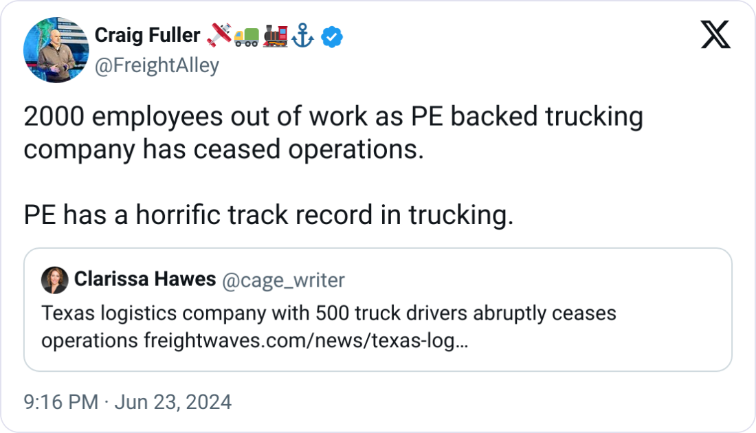 💼 USLS Leaves 2,000 Workers Stranded. U.S. Logistics Solutions abruptly ceased operations on Thursday night, leaving over 2,000 employees jobless and freight abandoned nationwide. The Texas-based company, owned by Ten Oaks Group (a private equity group), notified workers via text at 10 PM not to return to work. The message read, "Effective immediately, US Logistics Solutions is shutting down, and all employment is terminated. No routes should be run tonight, and all operations should be terminated immediately." With 500 drivers and 732 trucks suddenly idled, it's a logistics nightmare in the making. No paychecks were issued on Friday, and Ten Oaks remains silent.