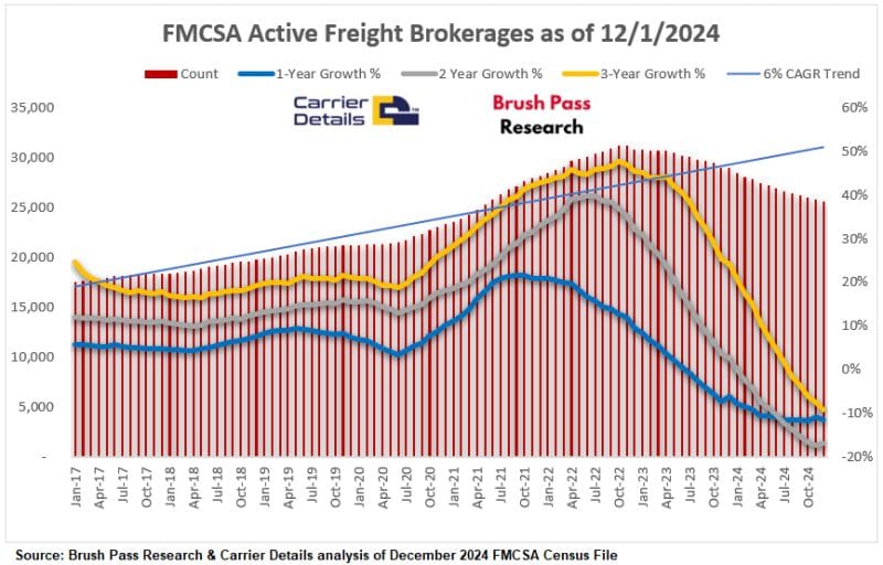 📉 Freight Brokerage Closures: By the Numbers. The freight brokerage industry lost 181 brokerages between November and December 2024, adding to a tough year. On average, 257 brokerages closed every month in 2024. The industry now has 2,900 fewer brokerages than expected based on 10 years of growth trends. This marks an 11.6% decline in active brokerages over the past year, though the five-year growth rate is still up 20.7%. A comment on Kevin Hill’s LinkedIn profile suggested that many closures are from brokerages launched during the COVID-19 boom, which are now struggling to stay afloat.