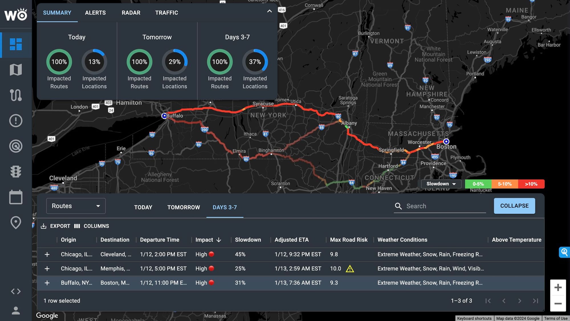 WeatherOptics CEO Scott Pecoriello highlights the severity of these conditions on trucking lanes, backed with data from the program quantifying shipment delays and driver risk. (Shipment delay: % shipment delay from normal due to weather & Driver risk: 0-10 scale of road danger).