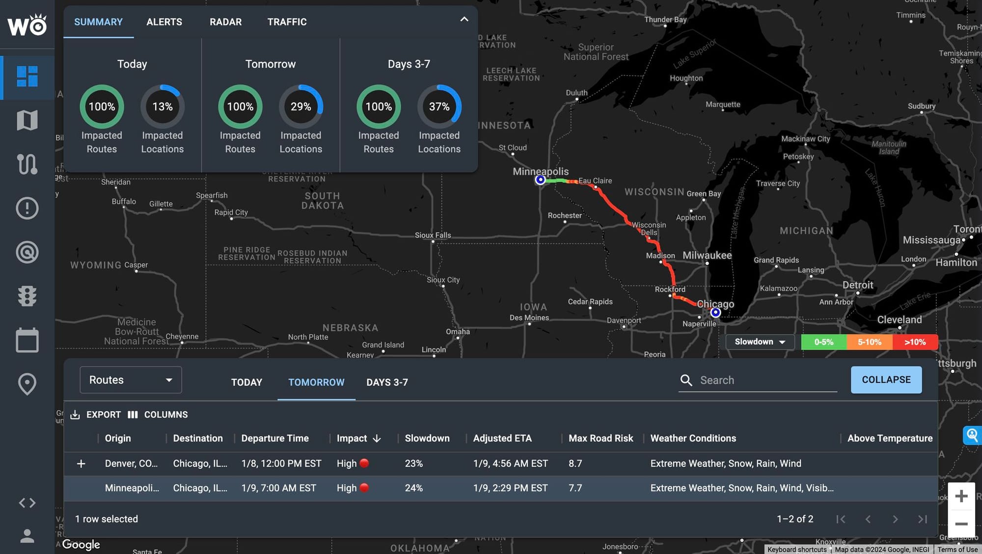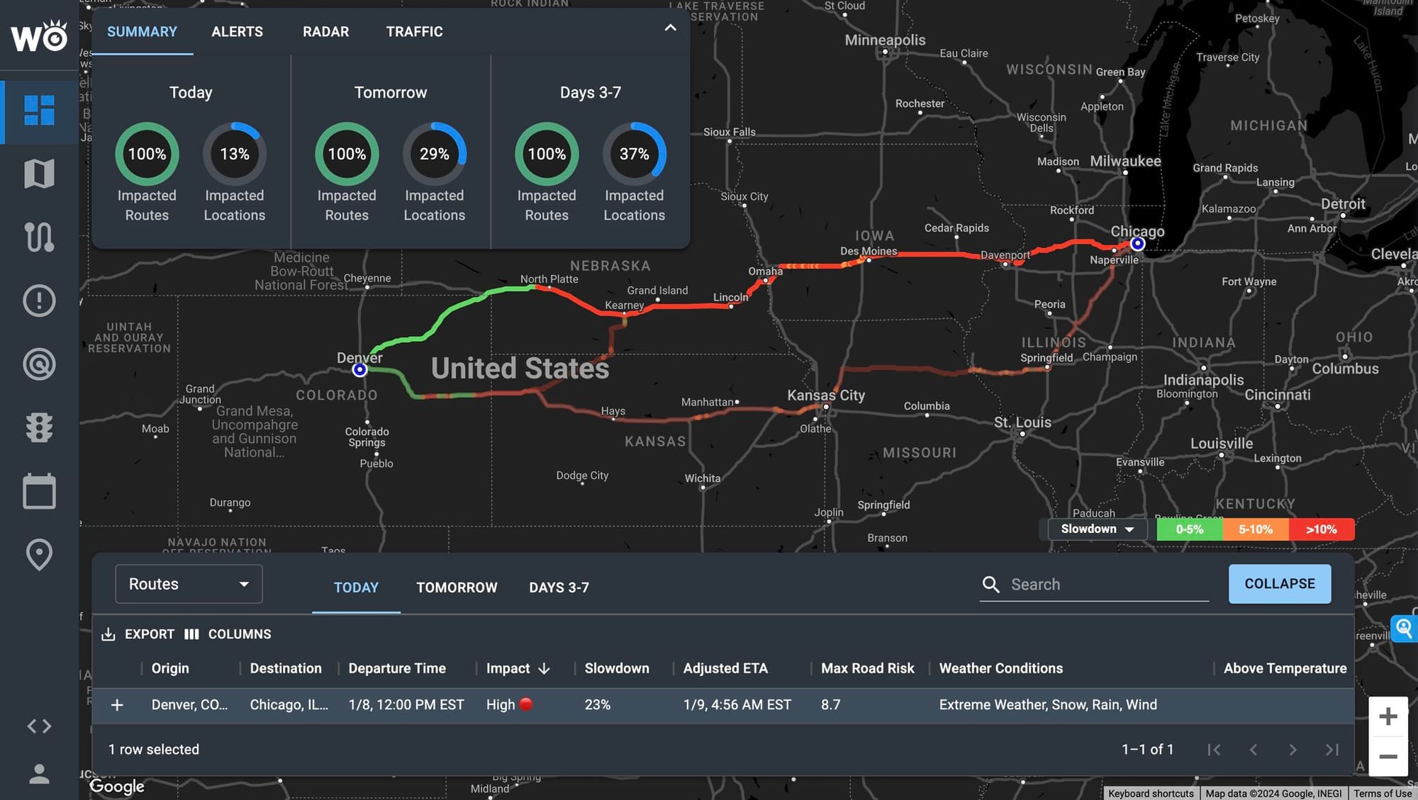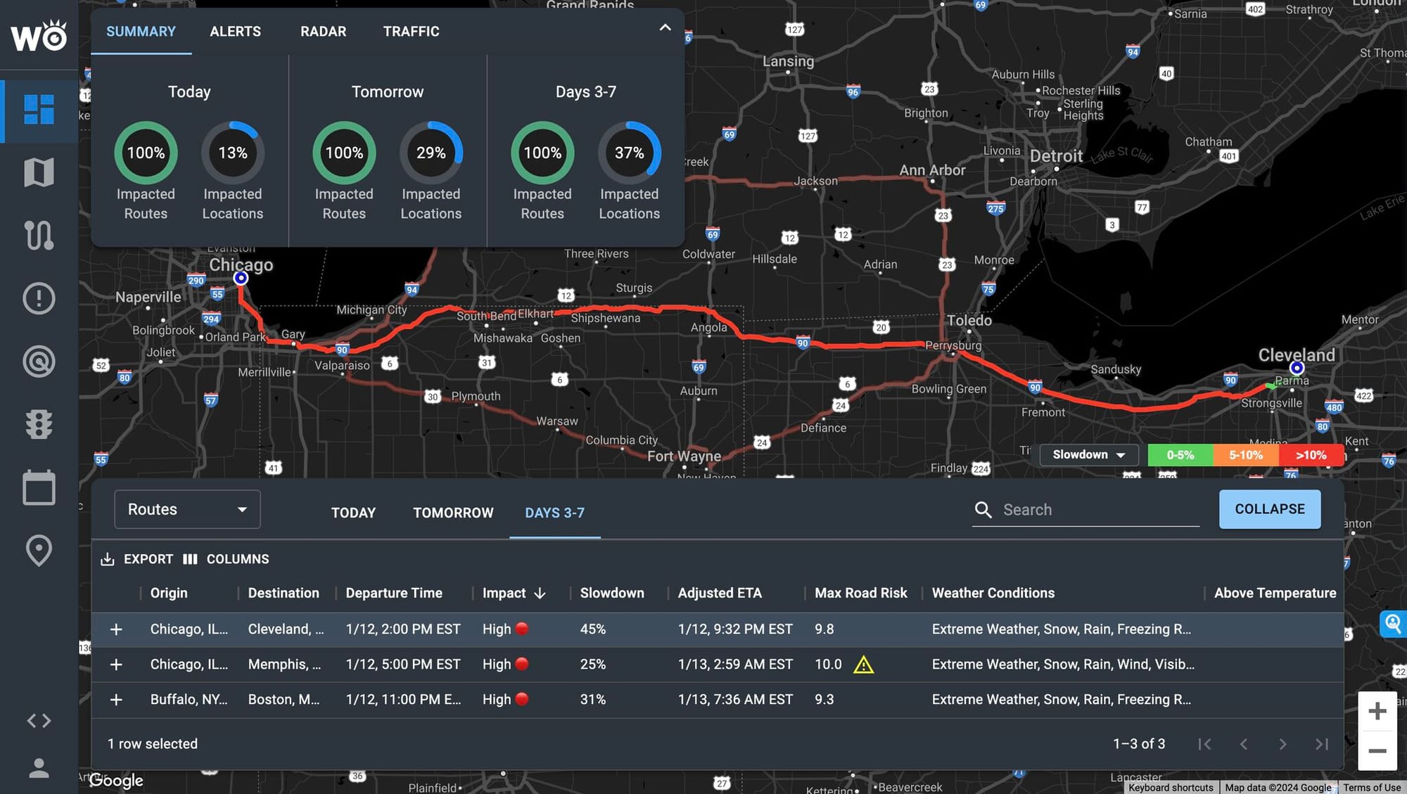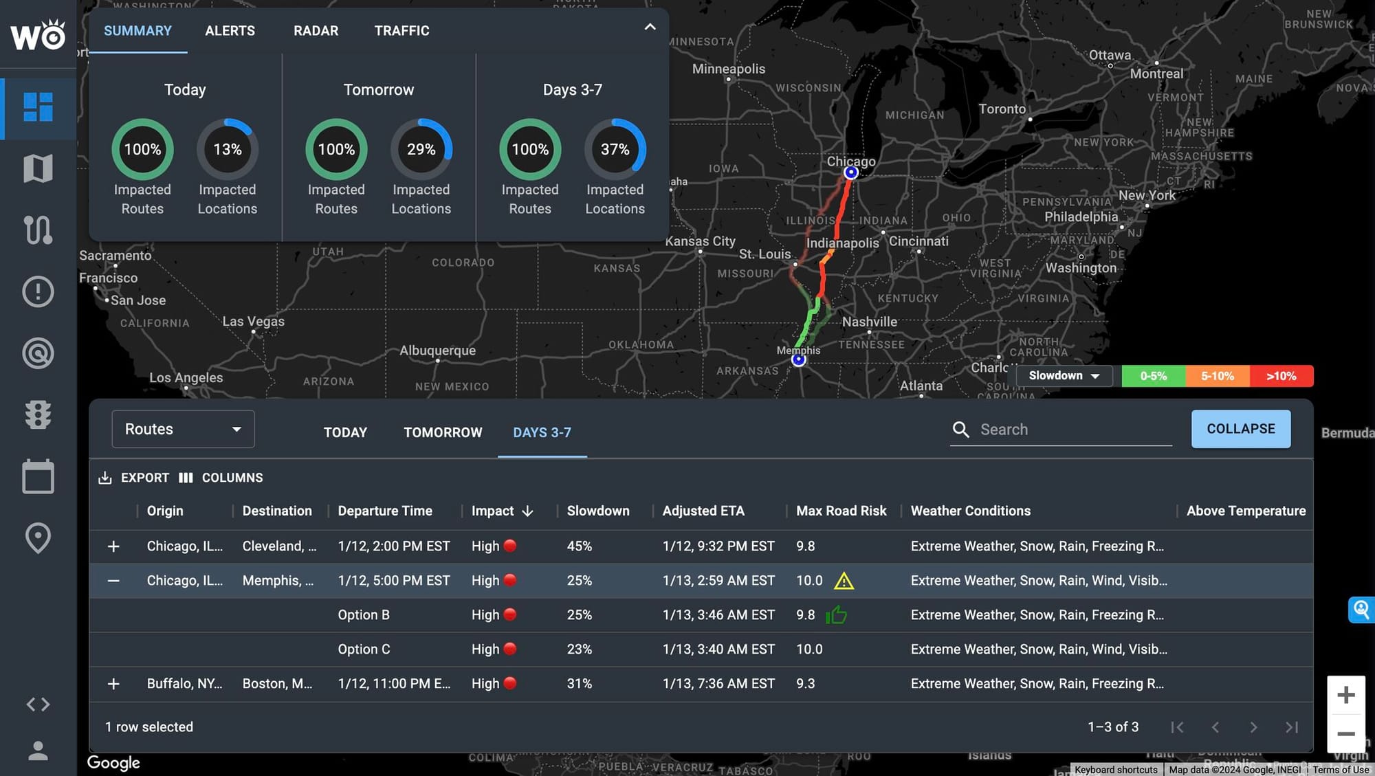 Top 5 Worst Lanes: Chicago appears in 4 of the 5 most impacted lanes, with extreme risks involving severe thunderstorms, blizzard conditions, and high winds.
