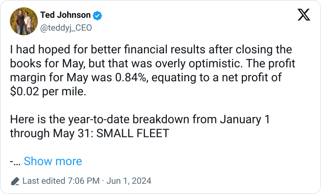 💸 Small Fleets Face Financial Challenges. Despite an optimistic outlook, Ted Johnson reports a modest 0.84% profit margin for May and a year-to-date profit margin of 3.03% for his small trucking fleet, with significant expenses in fuel (30.74%) and wages (28.10%).