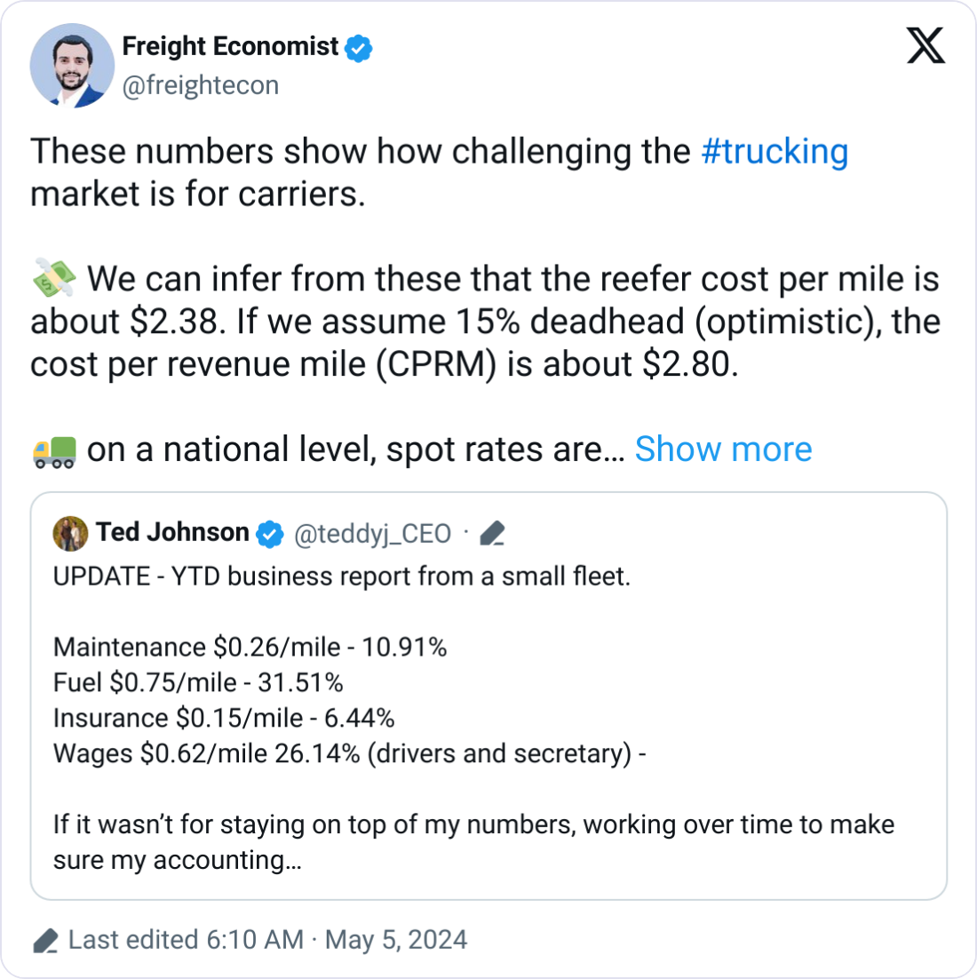 Uber Freight's Senior Economist Mazen Danaf points out that Elite's reefer cost per mile is $2.38, and factoring in non-revenue miles, the cost per revenue mile (CPRM) is $2.80.