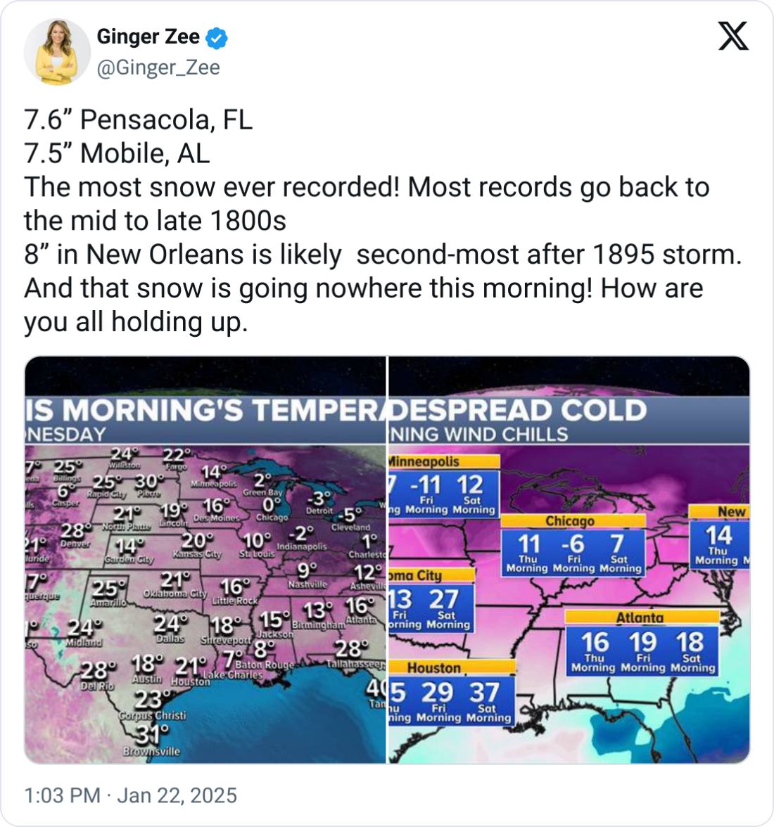 According to the National Oceanic and Atmospheric Administration (NOAA), the storm is tied to a polar vortex event bringing Arctic air deep into the South. While rare, events like this are becoming a topic of interest in climate discussions.