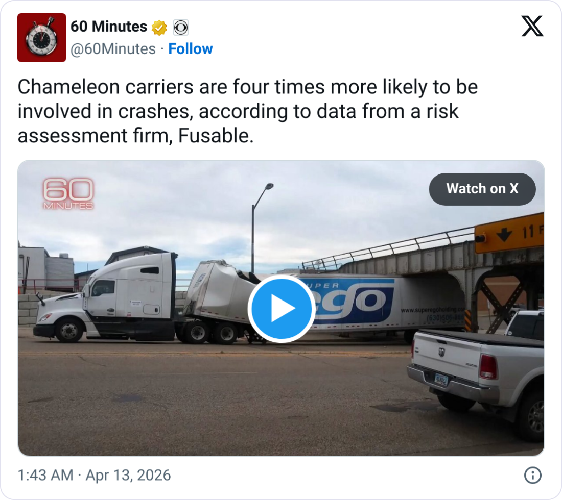 Good Monday morning. The freight industry's worst-kept secret just made primetime. 60 Minutes spent 8 months investigating chameleon carriers. Here's what the investigation found.